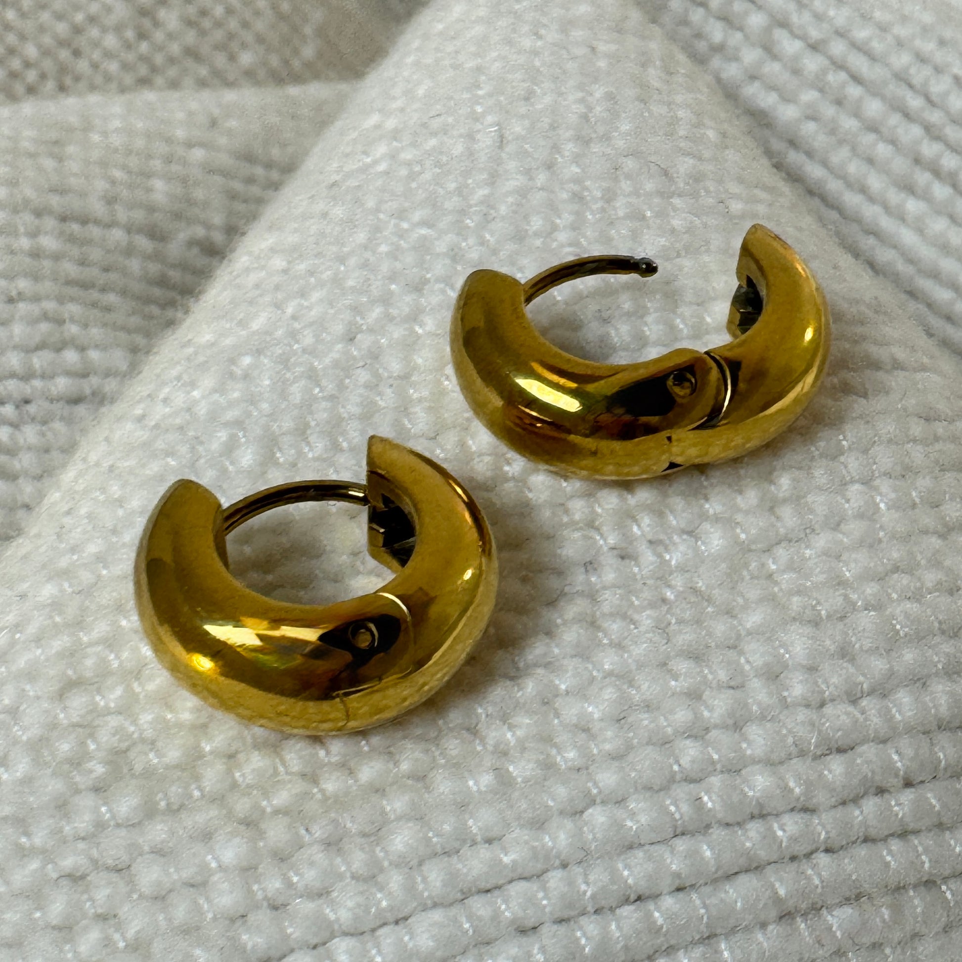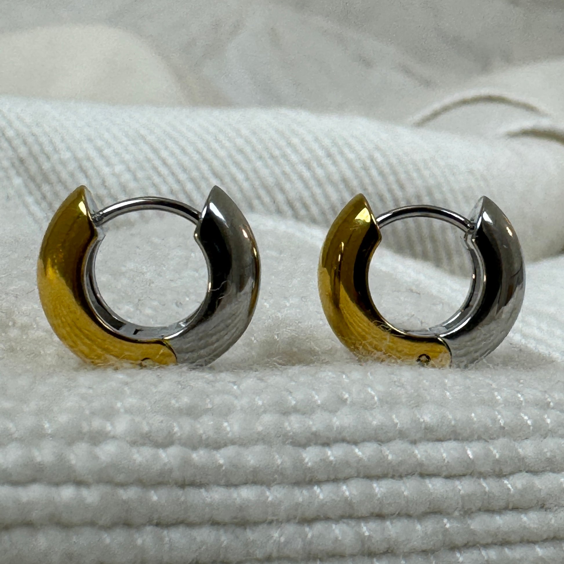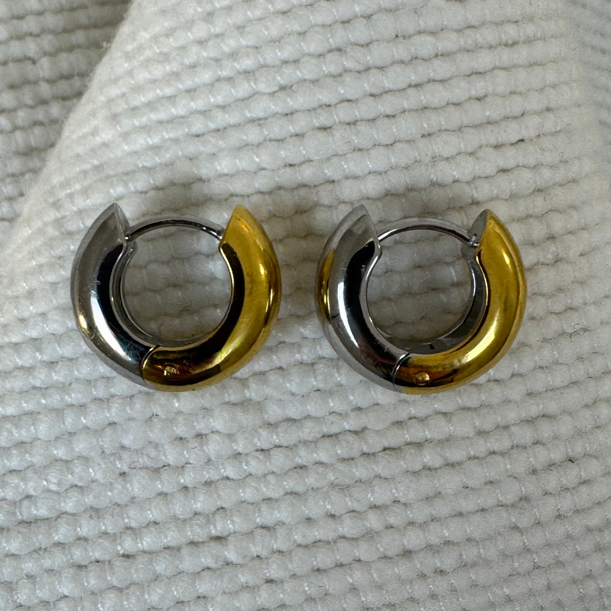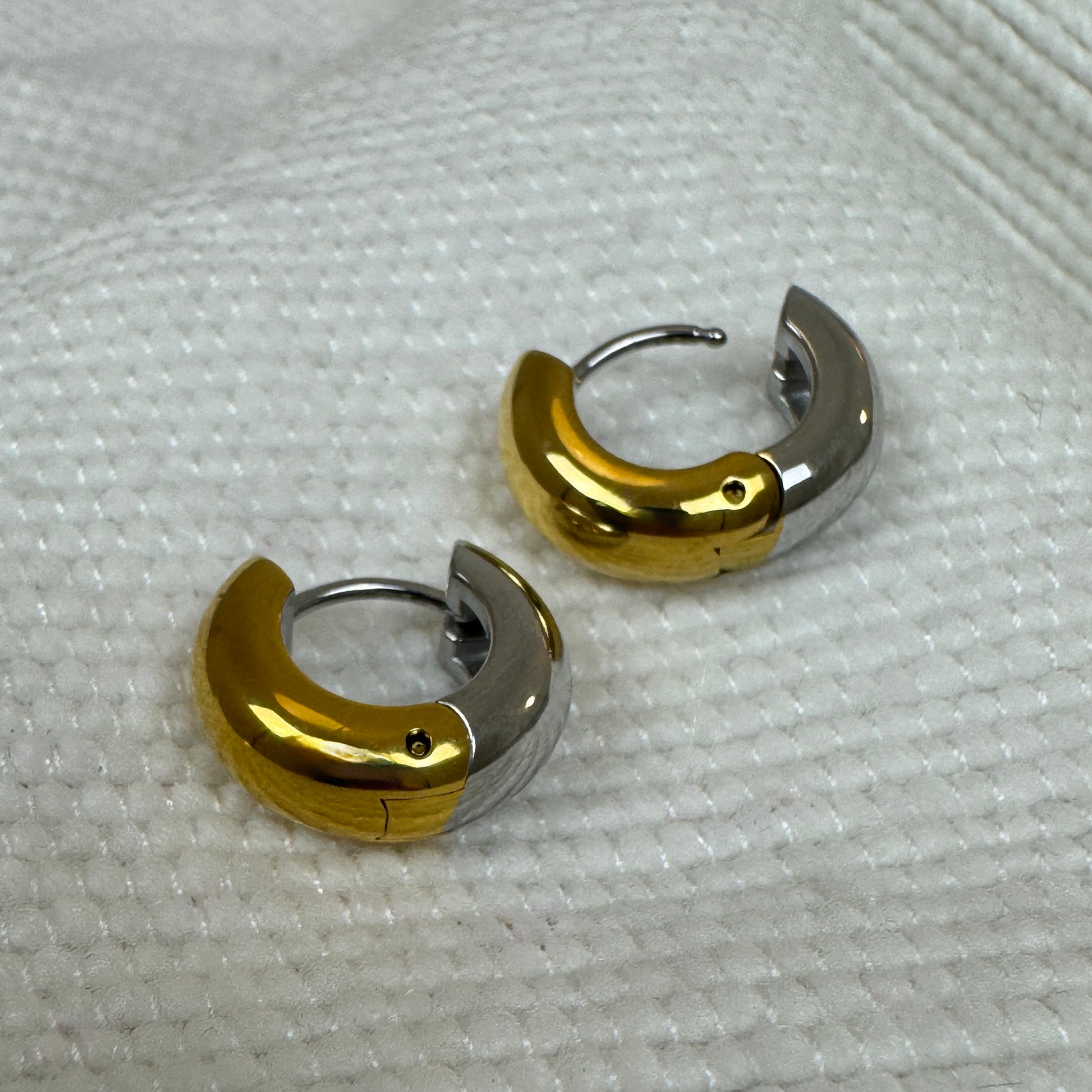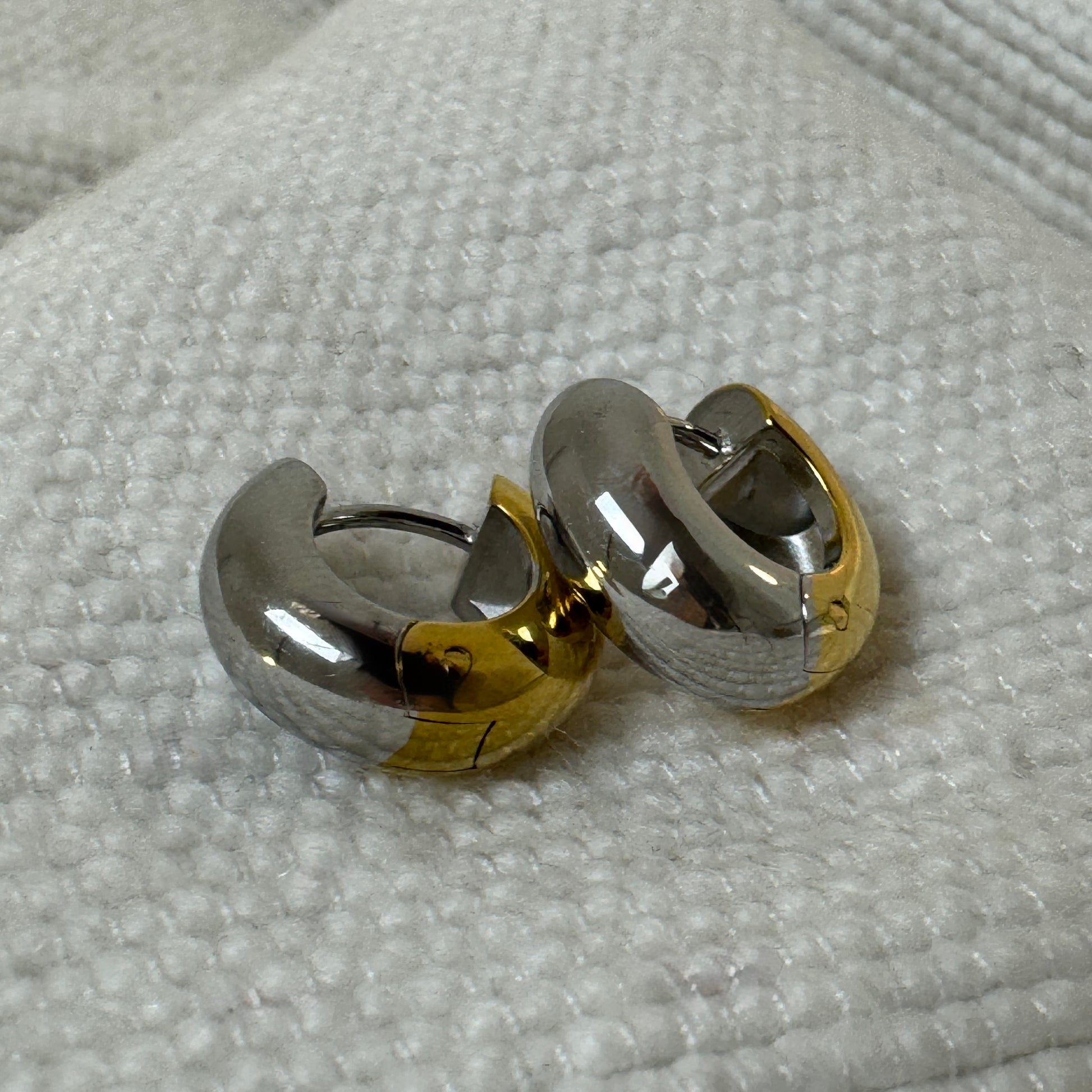 Extra thick small huggie earrings in either gold, silver or mixed metal. The gold is 18k gold plated stainless steel, while the silver polished stainless steel.
