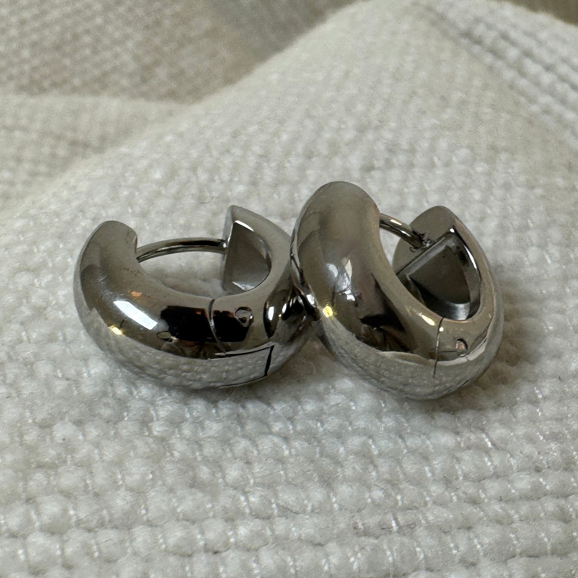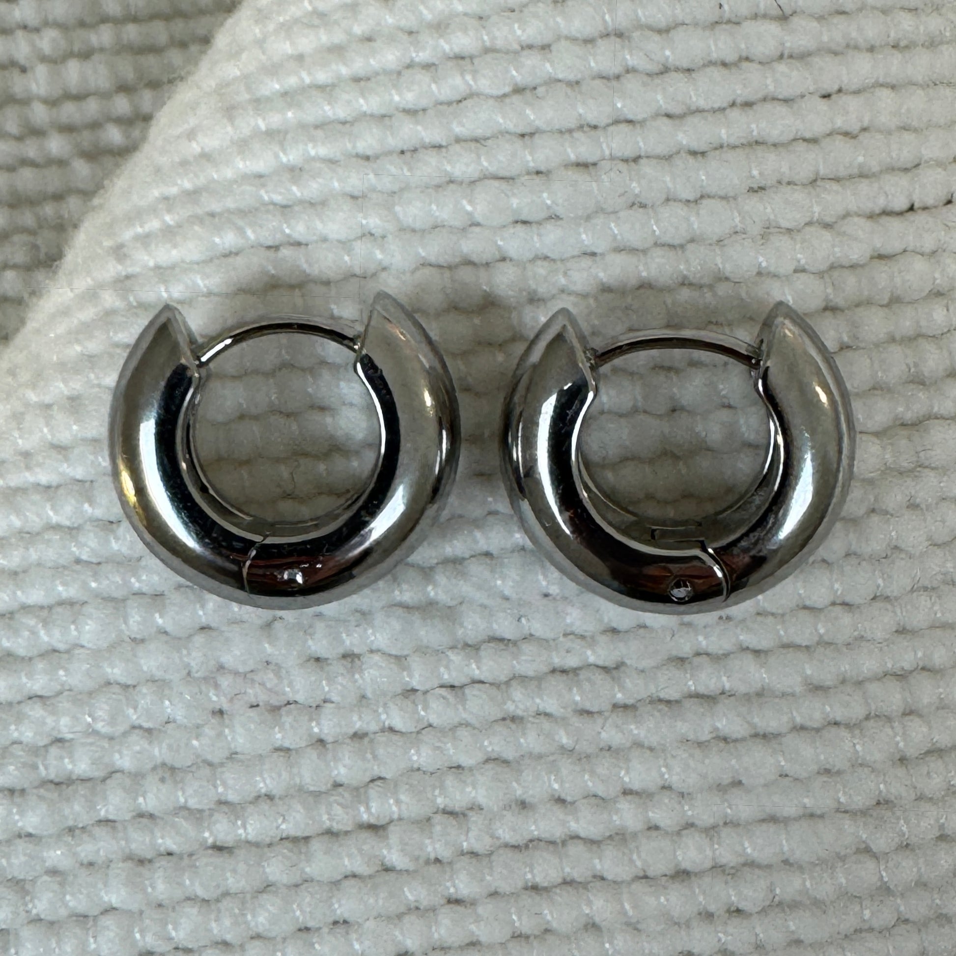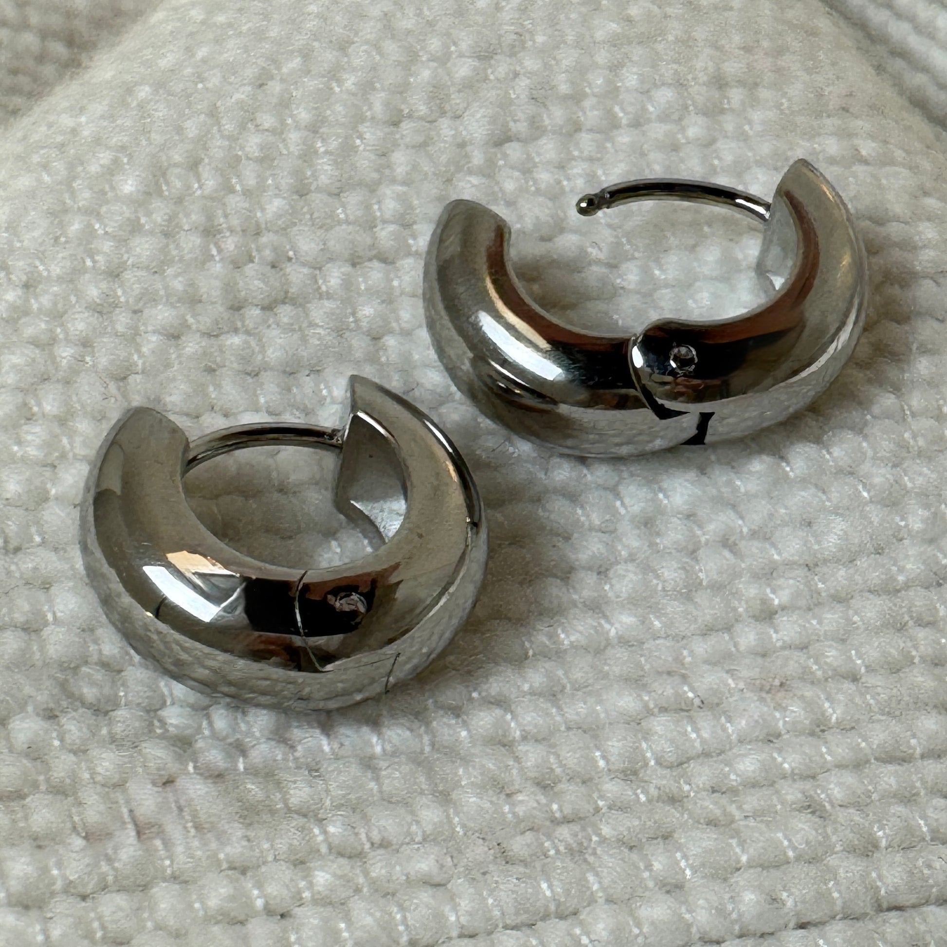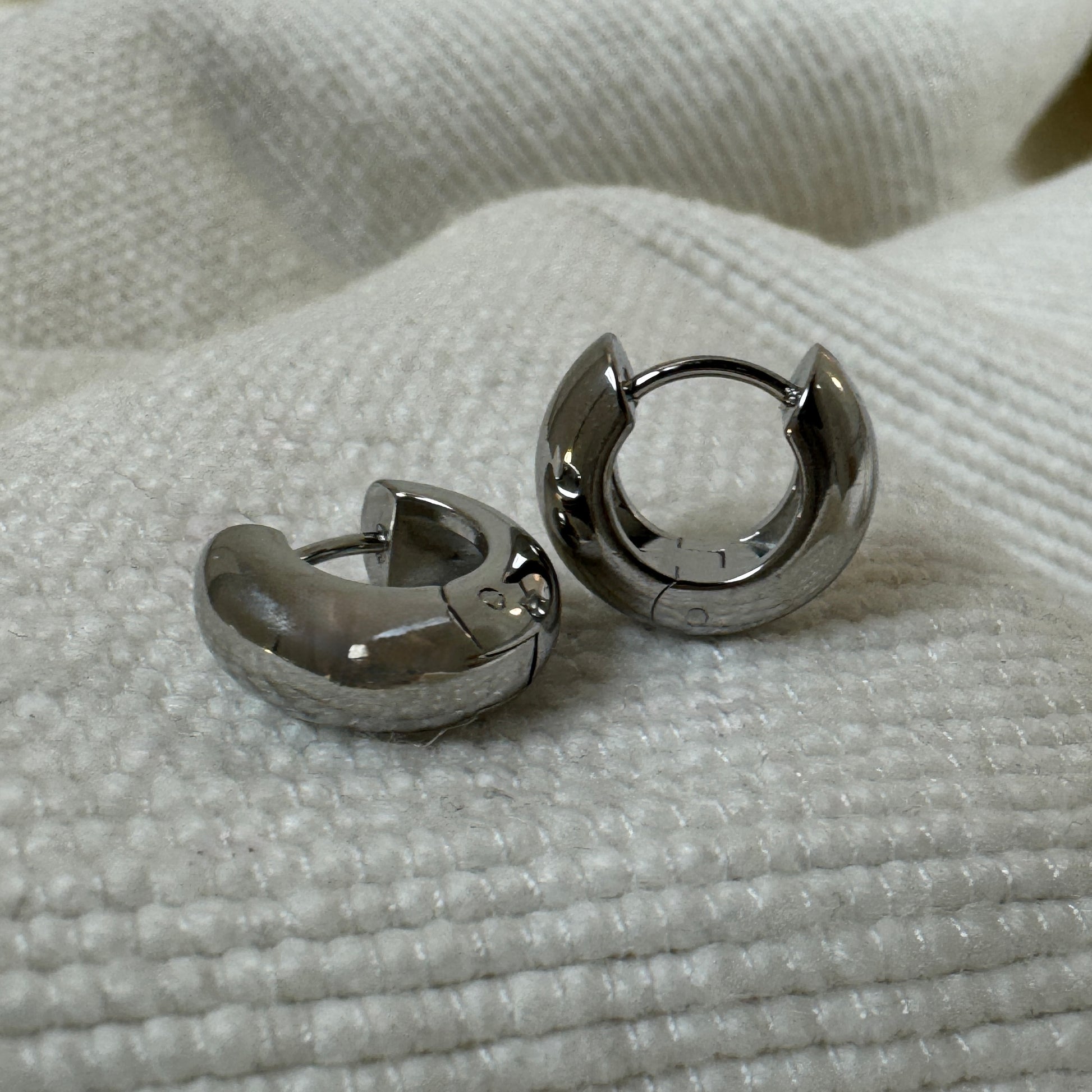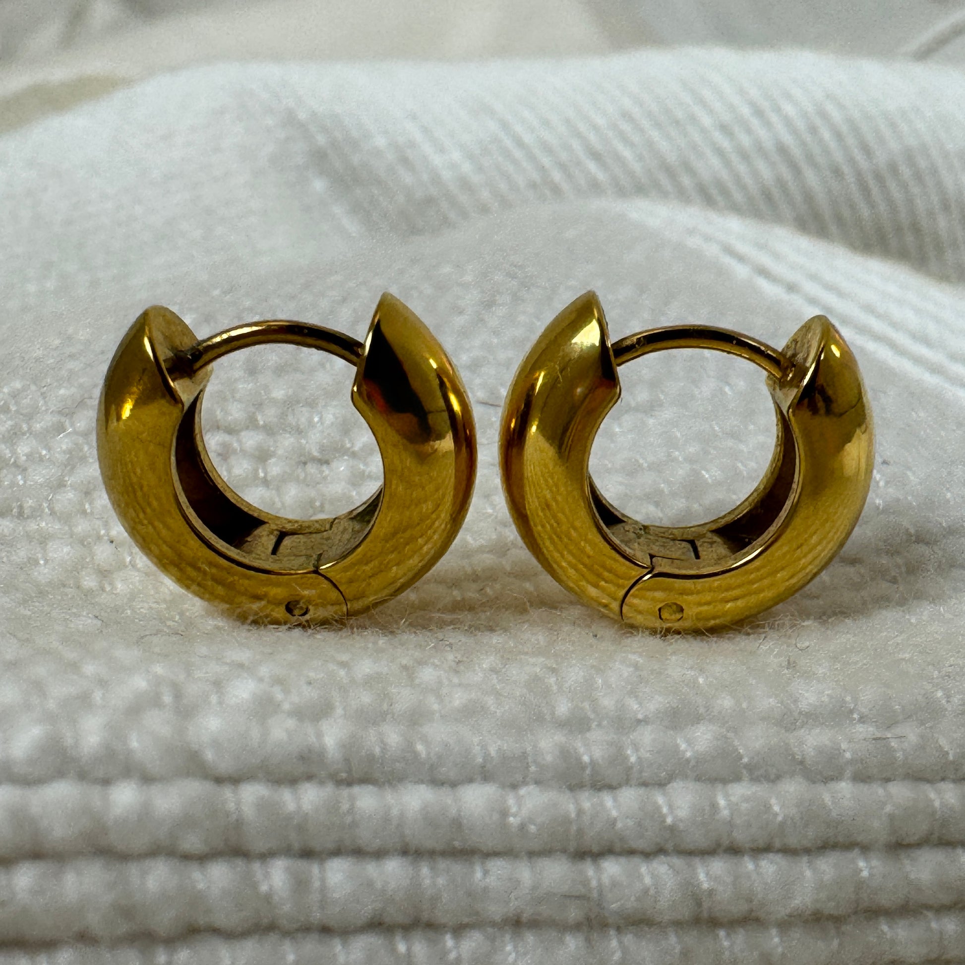 Extra thick small huggie earrings in either gold, silver or mixed metal. The gold is 18k gold plated stainless steel, while the silver polished stainless steel.