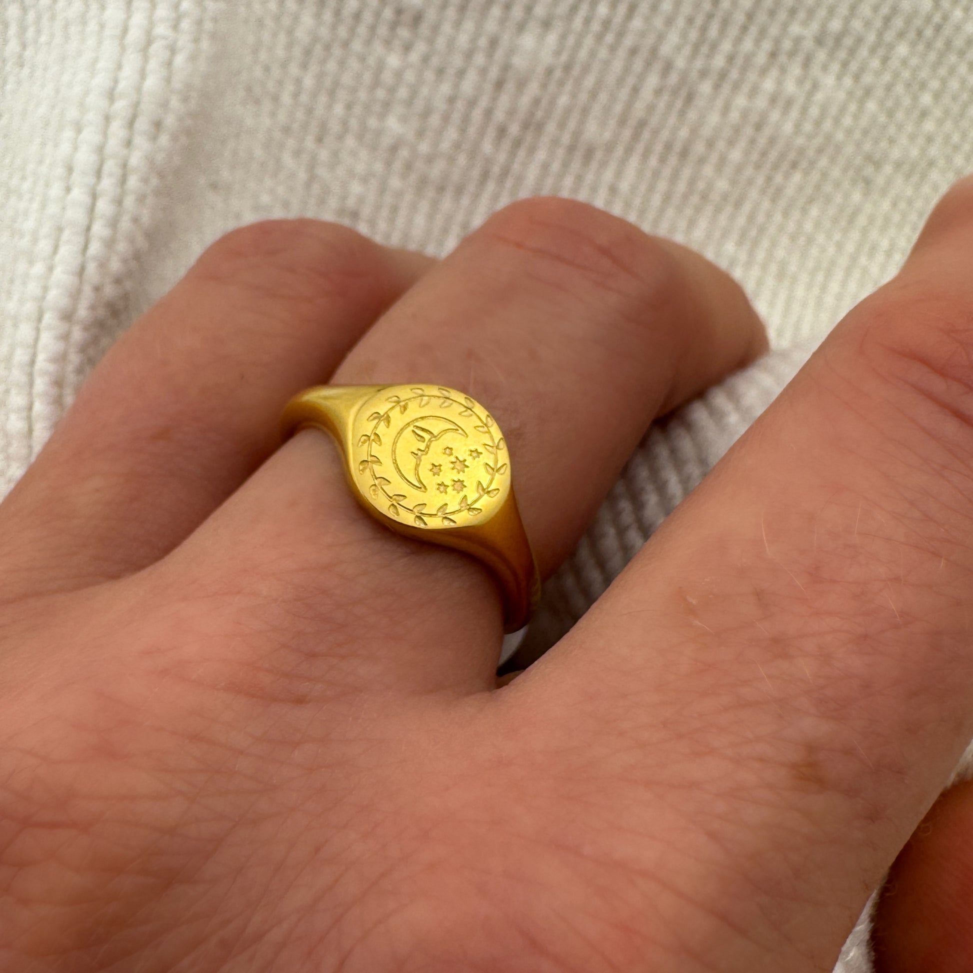 Crescent moon face engraved spiritual signet ring in 18k gold plated stainless steel.