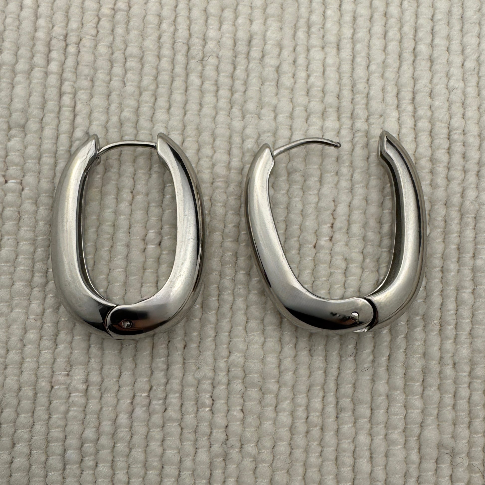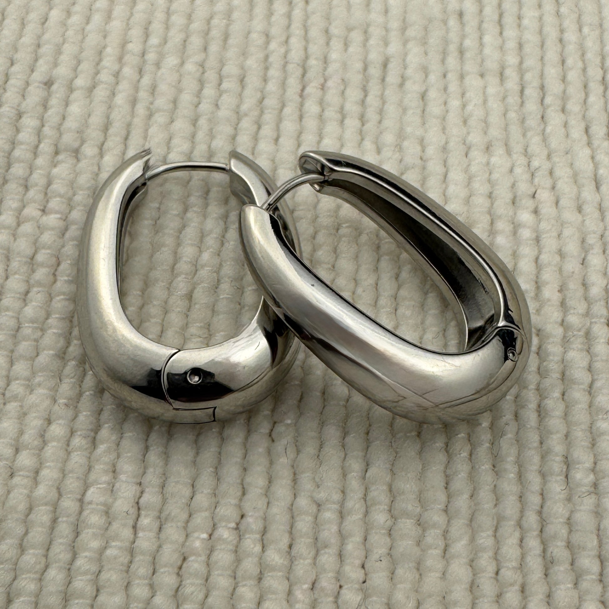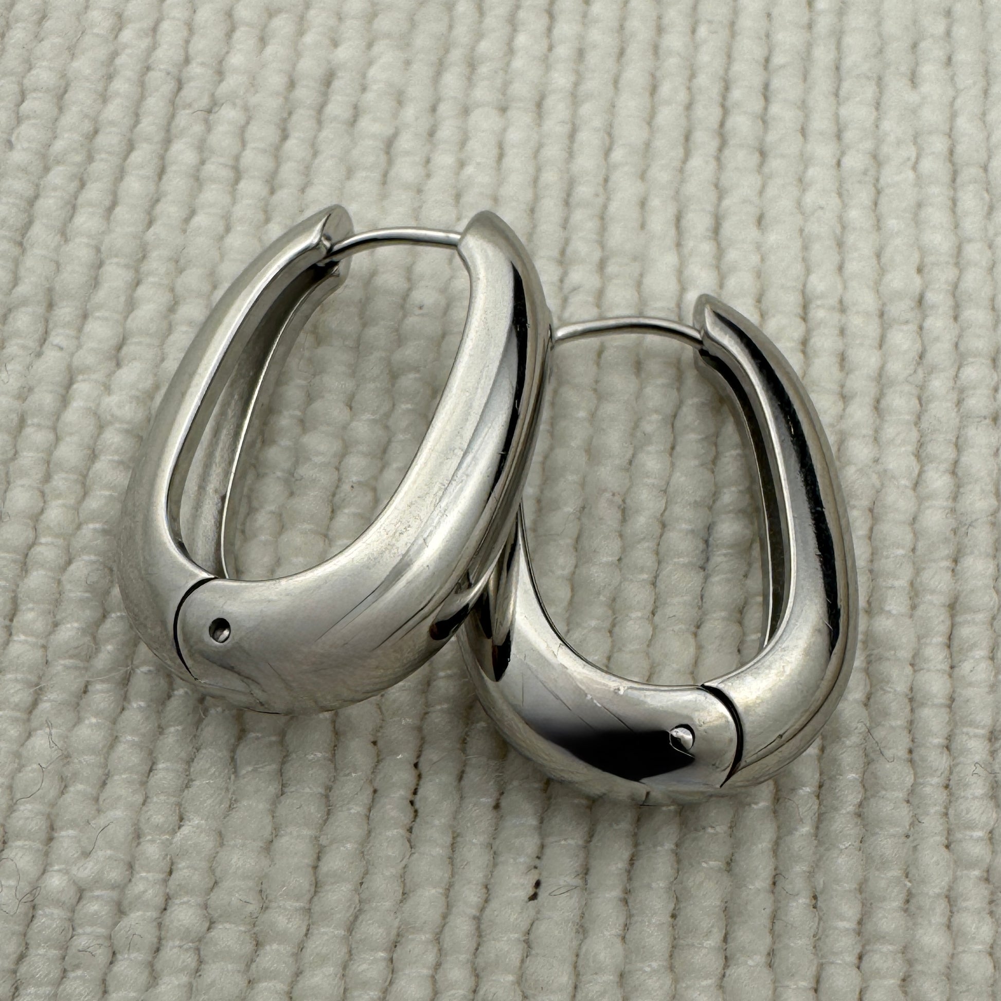 Teardrop huggie earrings in either silver stainless steel or 18k gold plated stainless steel.